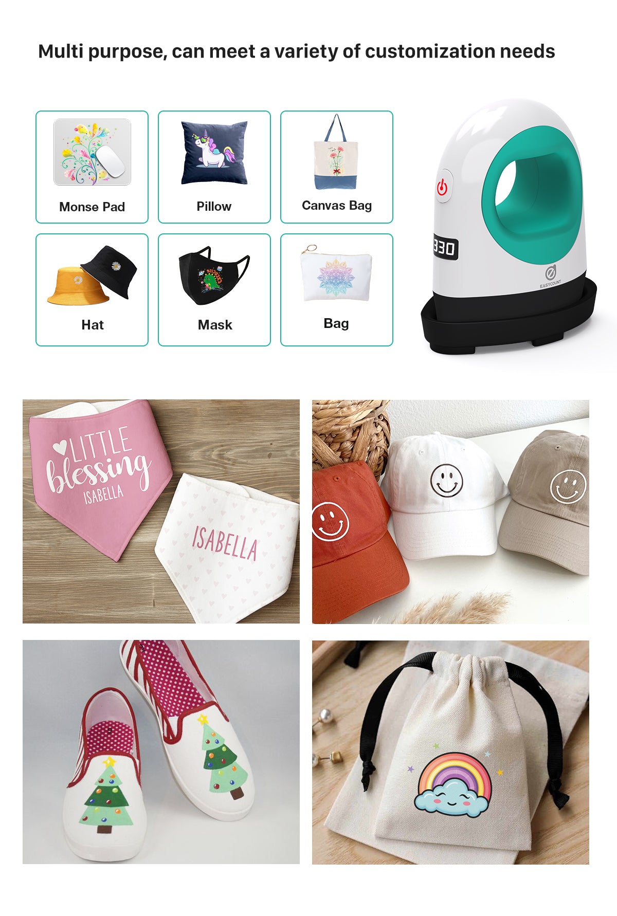 - Curved surface pressing (shoes, hats, mugs)